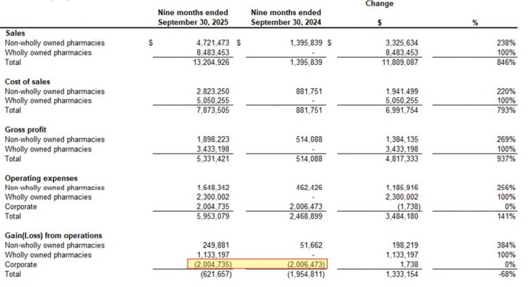 The fundamentals themselves are very early on to fully rate, but the revenue being generated from their first few locations look quite sustainable from an operational cash flow perspective, are EBITDA positive and near break even on Net Income. With just four operating pharmacies they are quite positive on their own from an operational gain/loss perspective with their corporate expenses sending them into the red. But those costs are flat YoY suggesting with additional scale they could turn profitably quite easily with added locations.
