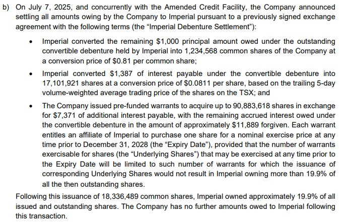 As you can see above, in addition to the $20.6M in interest payable, $1M was still left on the principal amount. That was converted into 1.23M shares and a small portion of the interest, $1.4M was converted into 17.1M shares at just over 8.1 cents. Using that same 8.1 cent figure they converted an additional $7.4M of interest into 90.9M pre-funded warrants which will expire at the end of 2028. That leaves $11.9M of interest which was essentially forgiven. Therefore as of July 7th, the company is finally free of their debt burden in relation to Imperial Brands.