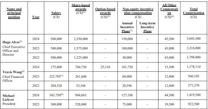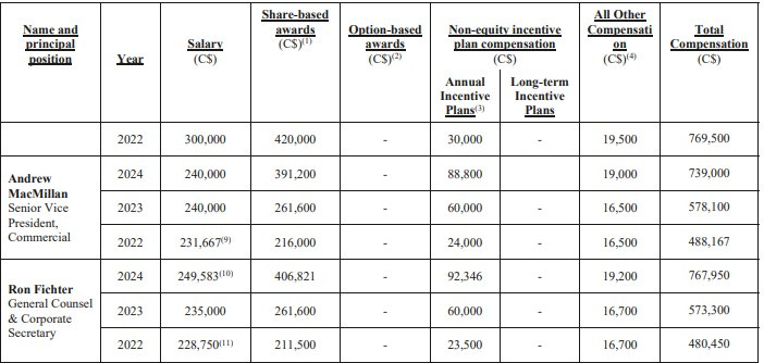 Above is the table of executive compensation for senior management for the past three years. I’ll let everyone make their own judgements whether or not this is fair compensation for a company that prior to this year had amassed a half billion in net losses since their inception.