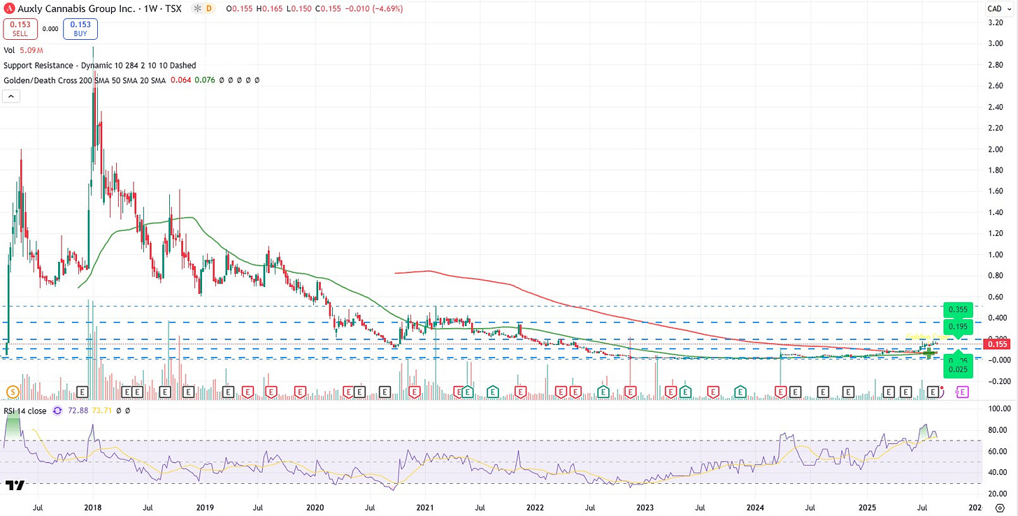 One trend over the past couple of years, particularly for underperforming companies is a move from option based SBC plans to a RSU/DSU/PSU or similar model. From 2018 onward, options were predominantly given as SBC within Auxly. Due to the long term chart looking like it does (pictured below) the vast majority of those options awarded over the years have or will expire unexercised and worthless. So enter the RSU plan over the past eighteen months to make up for lost time I guess.