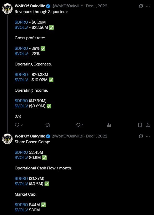 I’ve had this article in the mental hopper for sometime. I’ve just needed a catalyst to provide the inspiration (read frustrate & anger) in order to write it. This is where my two recent reviews of Volatus Aerospace and Draganfly Inc. come in. I’ve put out a lot of content over the past five or six years. Not only reviews, but posts to social media and various stock boards too. When researching my Volatus article over the weekend I came upon this Twitter thread I posted back in December of 2022. At the time I thought Volatus Aerospace looked interesting and was trying to justify why they were valued less than their small cap competitor, Draganfly.