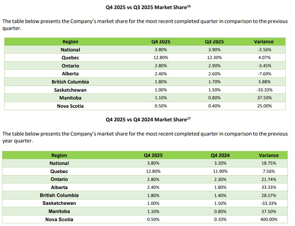 Year over year market share was strong with double digit gains across all provinces with the exception of Saskatchewan but was a little lumpier on a QoQ basis. October (below) has some very encouraging National gains which could be an indicator of a strong first quarter which investors will be able to see in January.