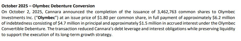After $1.5M savings to last year on combined debt reduction and interest rate relief, Net Income for their 2025 year totalled $13.1M, more than double last years $6.4. That also includes $5M in income tax expense when they had $1.95M of tax recovery in 2024. A very successful year for Cannara Biotech.