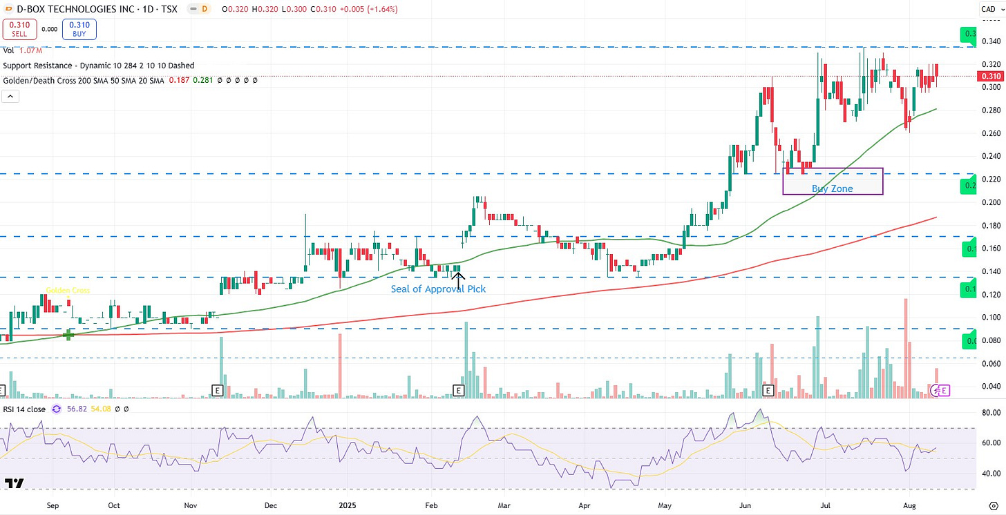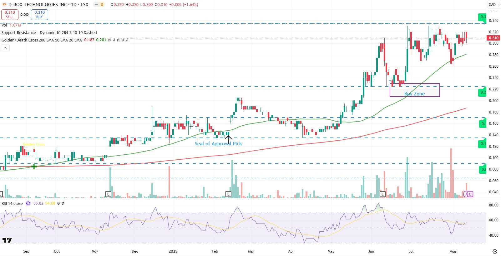 D-box Technologies was my first ever mid year Wolf Seal of Approval pick back on February 12th when they reported their Q3 last year. Those acting on that pick would be up a cool 114% since. If you were a believer in the stock prior to that, it is up a very impressive 365% from a year ago today. Even if you waited until my mid June buy zone, you would still have made 38%.