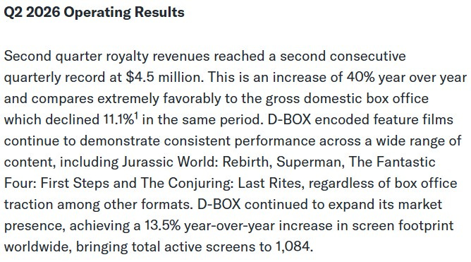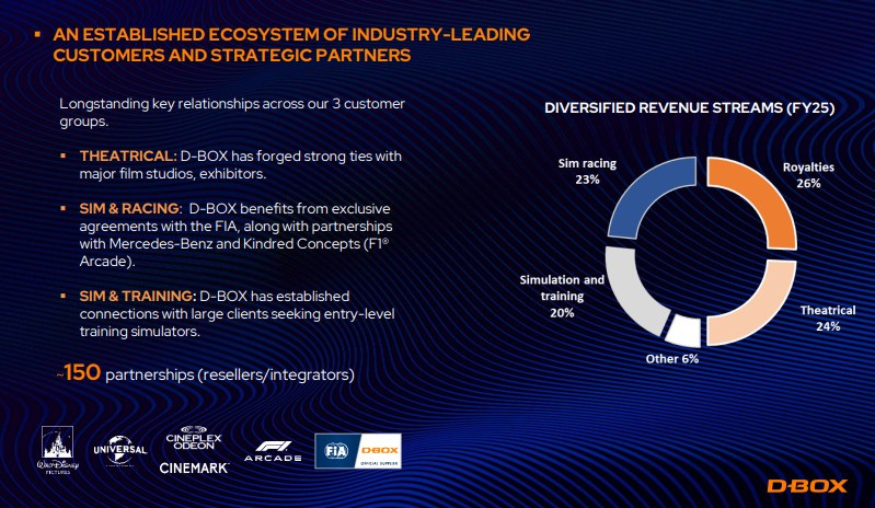 It would also be incorrect to assume that D-Box solely relies on the theatre industry itself - their revenue streams are much more diversified than that, and 50% of the YTD system sales come from other avenues.