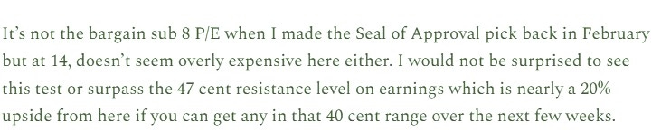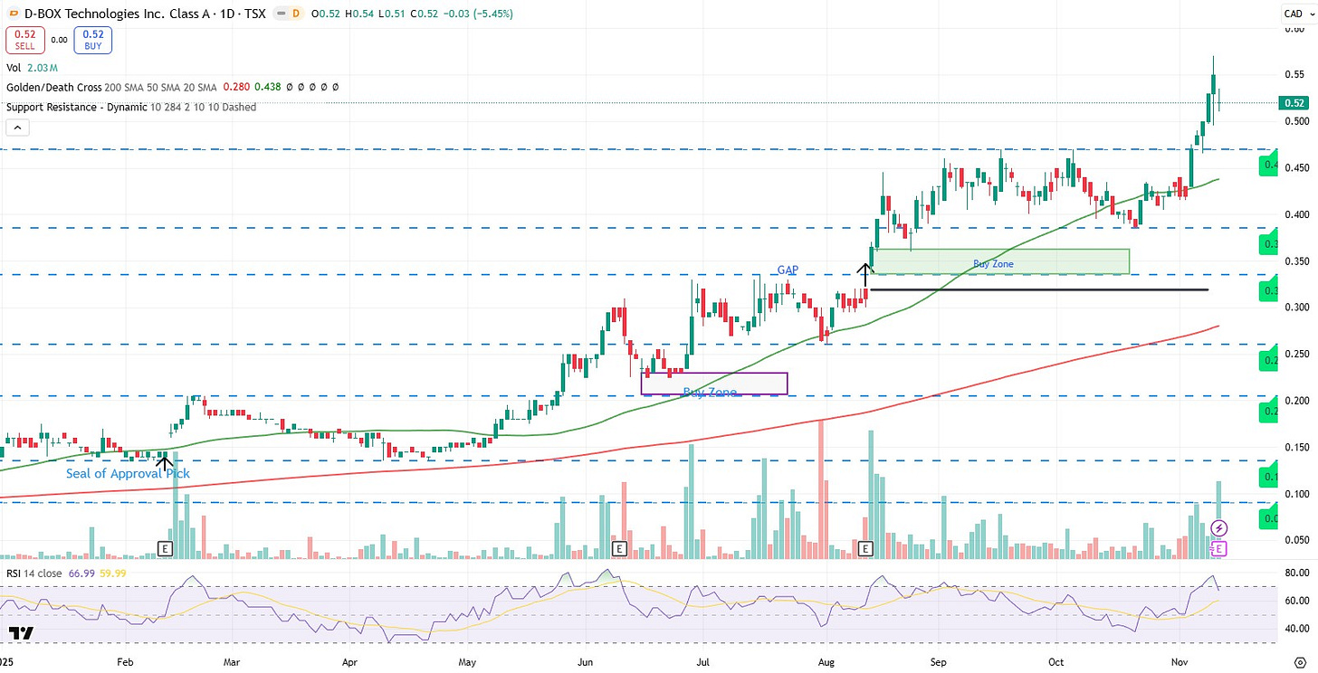 As of yesterday, D-Box was a penny shy of becoming a four bagger (300% increase) from when they reported their Q2 of 2024 financials back in February. That is also the date I gave D-Box the Wolf Seal of Approval. Had you added in any of the above buy zones you would have also made out pretty well too.