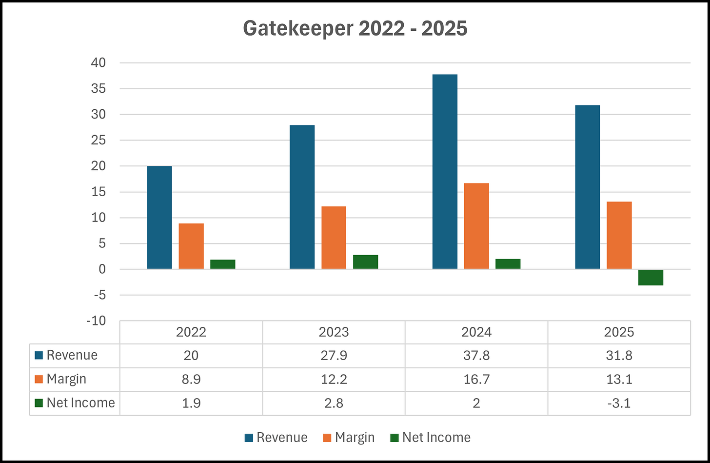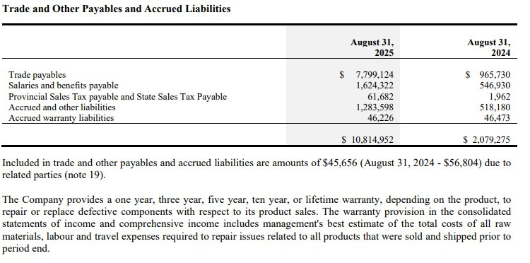 Gatekeeper’s balance sheet looks strong with a current ratio of 3.1 (deferred revenue removed) that consists of $14.8M in cash, $8M in receivables, $11.8M worth of inventory and $1.1M in prepaids over top of $12M in liability commitments during their 2026 fiscal year that began on September 1st.