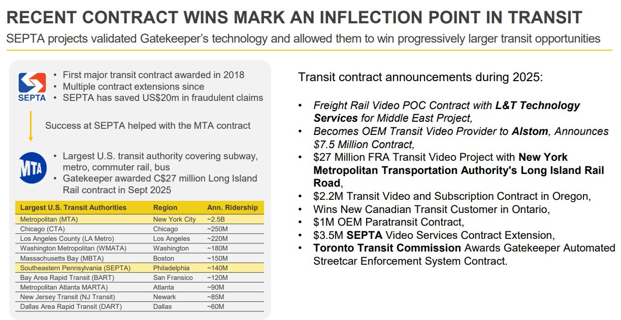A significant amount of contract wins. Approximately $45M worth with most announced within a thirty day window. There was the big one of course with LIRR (Long Island Rail Road) for $27M, with additional opportunities across North America as more regions adopt legislation requiring products for which they are considered an industry leader. Then most recently, a middle east contract opening up other areas many investors were not even discussing until recently. The bull case re-awakened.