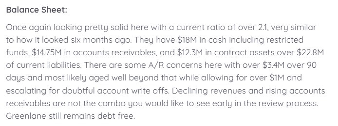 Greenlane has a better than decent current ratio of 1.65 that consists of $18.3M in cash (including $1.7M of restricted), $11.1M of receivables, $1.5M worth of inventory on hand and $3.9M of other short term assets over top of $21M in short term liability commitments over the next twelve months.