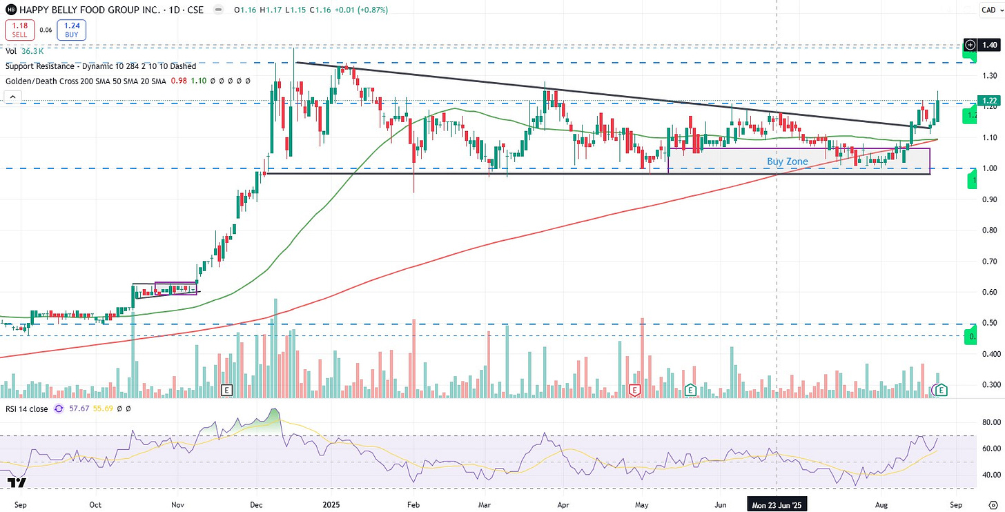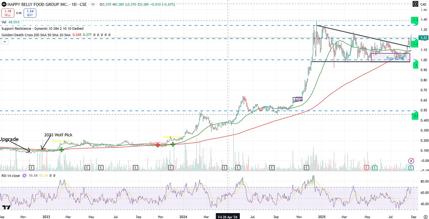 Happy Belly was within the group of my inaugural Wolf Picks announced at the start of 2023. Four of those five have gone on to multi-bag with a equal weighted return of 395%. HBFG has been far and away the most successful of the group in terms of share price appreciation. The ticker was VEGN back then and in November of 2022, I awarded the company their first “FINS Upgrade” when the stock traded at just eight cents, and several weeks later were part of that illustrious group of 2023 picks when it traded at just a dime. As of close yesterday, it traded at $1.22 for a twelve bagger (15x if you snagged some on the upgraded review).