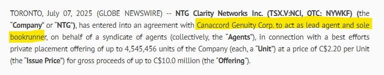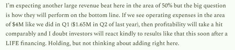 As mentioned, post financials the company raised $9M through a LIFE financing that closed in mid-July. The raise was done at $2.20 with a half warrant at $2.95. Unfortunately the raise was also done as a 6&6 LIFE deal - 6% commission and 6% in warrants and done through microcap bottom feeder, Cannacord. Based on what the company has accomplished in the past 18 months, they really should have been able to secure a better deal IMO. Participants in that offering are down 17% as of yesterday’s close.