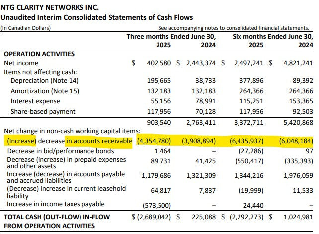 But when you allow your customers up to six months to pay their bills (30-180 terms), you incur a lot of expenses during that time frame which has a very negative impact on cash flows. This can result in dipping into debt through lines of credit, or in NCI’s case, entering into dilutive financing which occurred slightly after their Q2 ended. Let’s use that as a segue into their cash flow sitch.