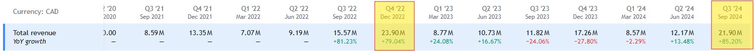 Extremely impressive top line in Q3 with $16.05M in revenue, 82% better than Q3 of last year. This brings their YTD top line to $31.3M, 34% better than 2023. This is also 80% more on a QoQ basis and the vast majority of their YTD increase can be attributed to what they did here in Q3.