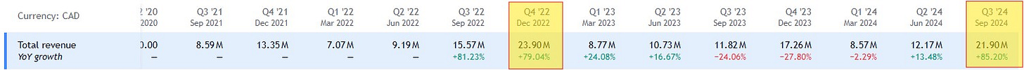 It appears they have excited investors in a similar way almost two years ago with nearly $24M (CAD) in the final quarter of 2022 with record net income there as well. They have yet to match that record quarter almost two years later including this very good one. Another factor is the reliance on political ads which drove about 30% of their Q3 revenue. This contributes to lumpy revenue, particularly in non election years.
