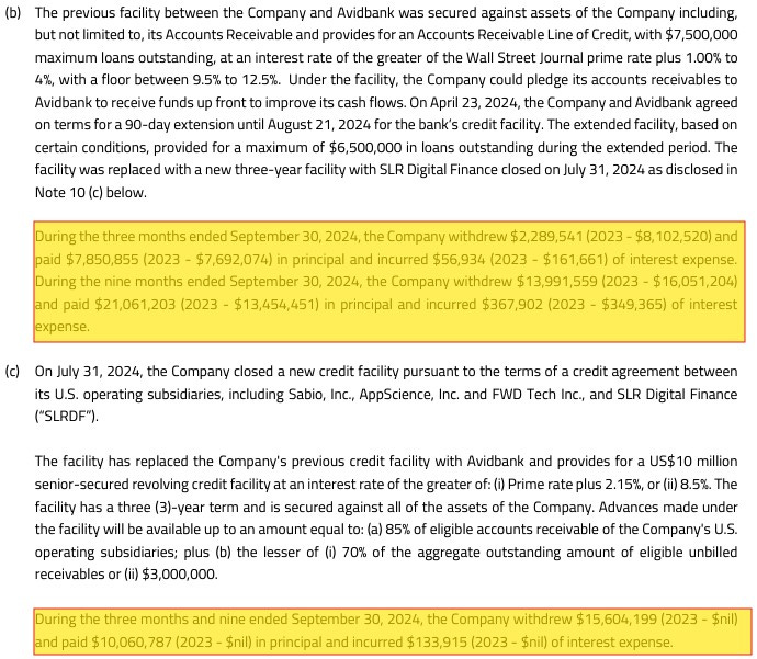Sabio switched lenders in the quarter and secured better interest rates in the process. The activity within these facilities is quite interesting. In their original $7.5M LOC with Avidbank, they made $14M in draws and $16M in payments, and in the new $10M facility with SLRDF $15.6M in draws and $10M in payments. They are in and out these things so often it would make Ron Jeremy exhausted. This is a lot of borrowing from Peter to pay Paul.