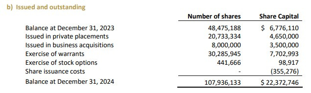 - 107.9M shares outstanding with significant dilutionary measures from capital raises and warrants exercised, particularly in Q4