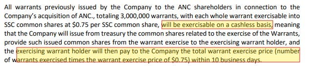SSC had no long term debt, but they do have $7.4M in current promissory notes and a $650k short term loan. About half of those promissory notes was due to ANC as part of the acquisition. On the date of filing (yesterday) this promissory note was restructured. While the amounts were pushed back, the ANC debt holders appear to have made out like bandits - more to say on this in the Share Capital section.