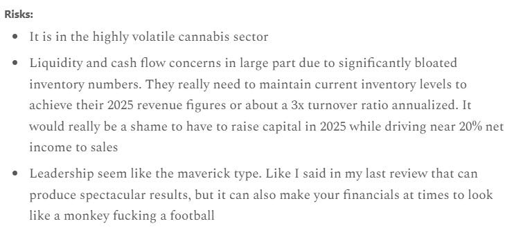 With CannMart at an annualized revenue figure of $13.6M and ANC at $10.6M along with the newly acquired Humble producing $11.2M, SSC’s top line should continue to be strong in 2025. Everything else becomes a giant question mark, including continued faith and trust in this management group after the fiasco over the last two months.