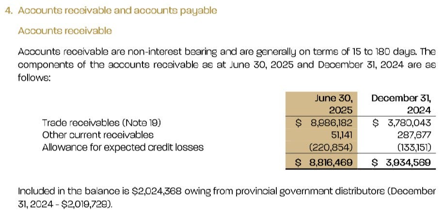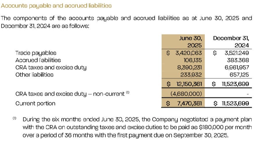 But it looks like they caught a bit of a break during the quarter with negotiations with the CRA as they have been delinquent with taxes and excise duties (not uncommon in the Canadian weed sector), with regular monthly payments pushed out into the end of September.