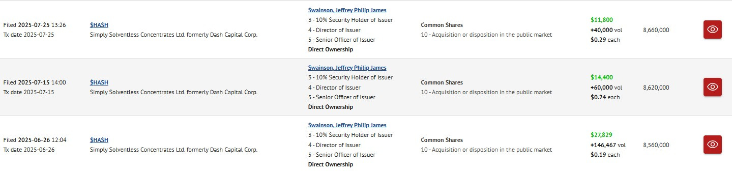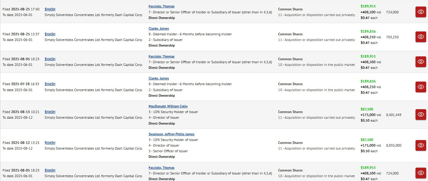 But then in August a series of transactions appeared on SEDI, among a couple others in July (not shown here) that were filed significantly late. I find them puzzling.