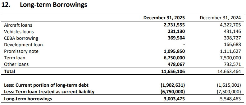 Volatus has over $19.5M worth of debt, $7.9M of those in convertible debentures with the balance in more traditional debt across seven different loans and notes. Nearly 75% or $8.65M is due in within 2026.