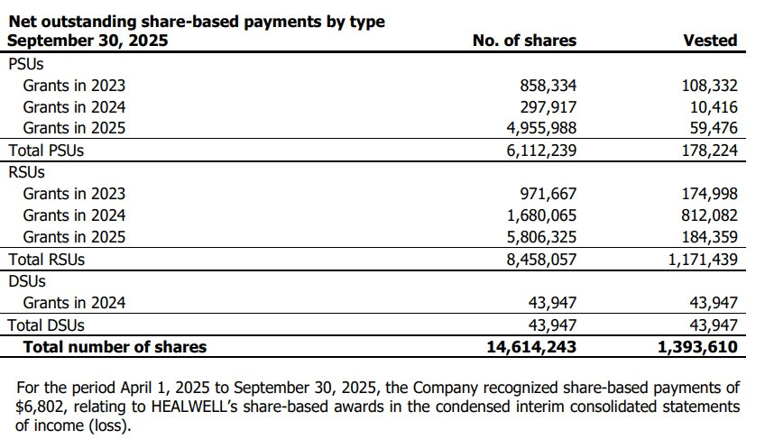 Within their subsidiary Healwell AI, 14.6M PSU, RSU and DSU’s outstanding including over 10.7M stock awards granted this year