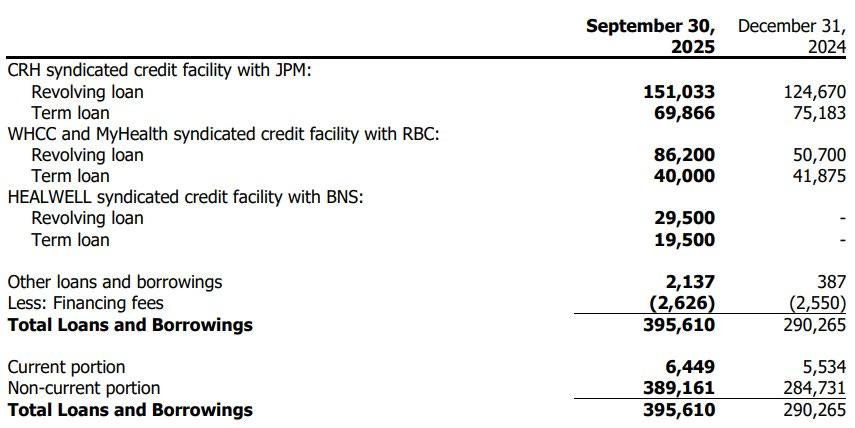 Including convertible debentures, Well has $485M worth of debt. That is up about $100M from the beginning of the year, about half from the Orion acquisition and the other inherited from Healwell AI coming under their umbrella as a subsidiary.