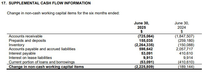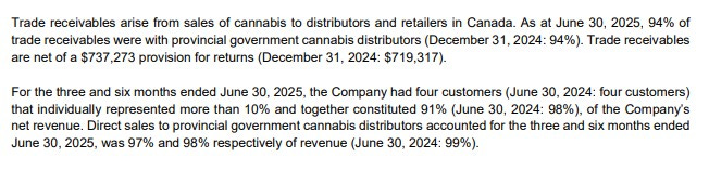 Normally, I would like to see an aging report but alas, the company does not provide one. And normally a 94% concentration of receivables with four customers might be a concern but since these customers are provincial distributors like the OSCR, we can safely assume they are good for it.