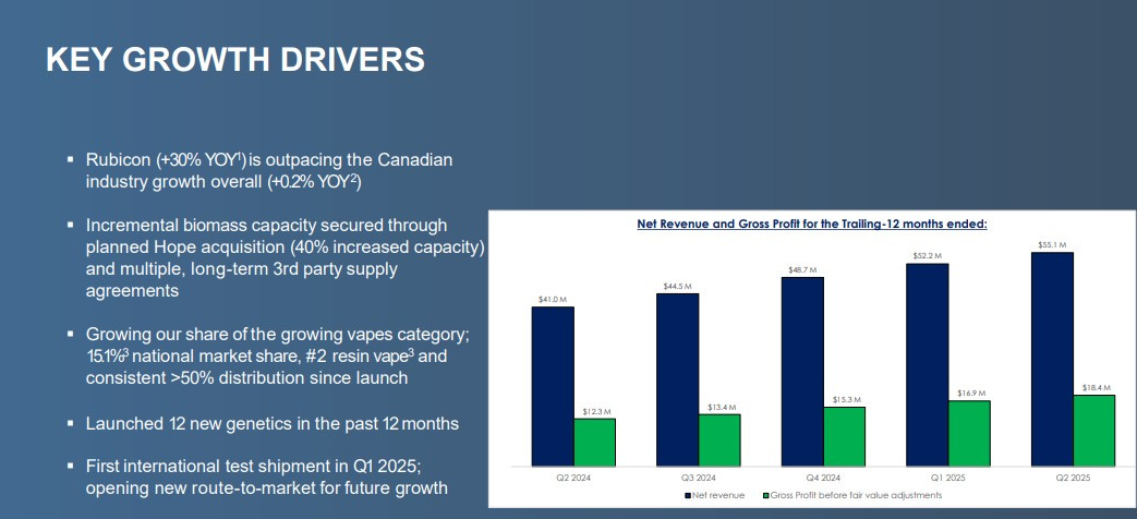 In Q2, Rubicon delivered just shy of $15M in net revenue after excise taxes, 24% better than the comparable quarter. Their gross profit rate also surged by 570 basis points from 33.5% last year to 39.2% here. I’m always a little bit leery of GP rates in this sector as they can be influenced heavily by FVA’s (fair value adjustments) as sometimes they can go the other way and be quarter killers. The good news here is their GP rate also went up by 400 basis points prior to these adjustments. Therefore on 24% more business ROMJ delivered 45% more gross profit dollars.