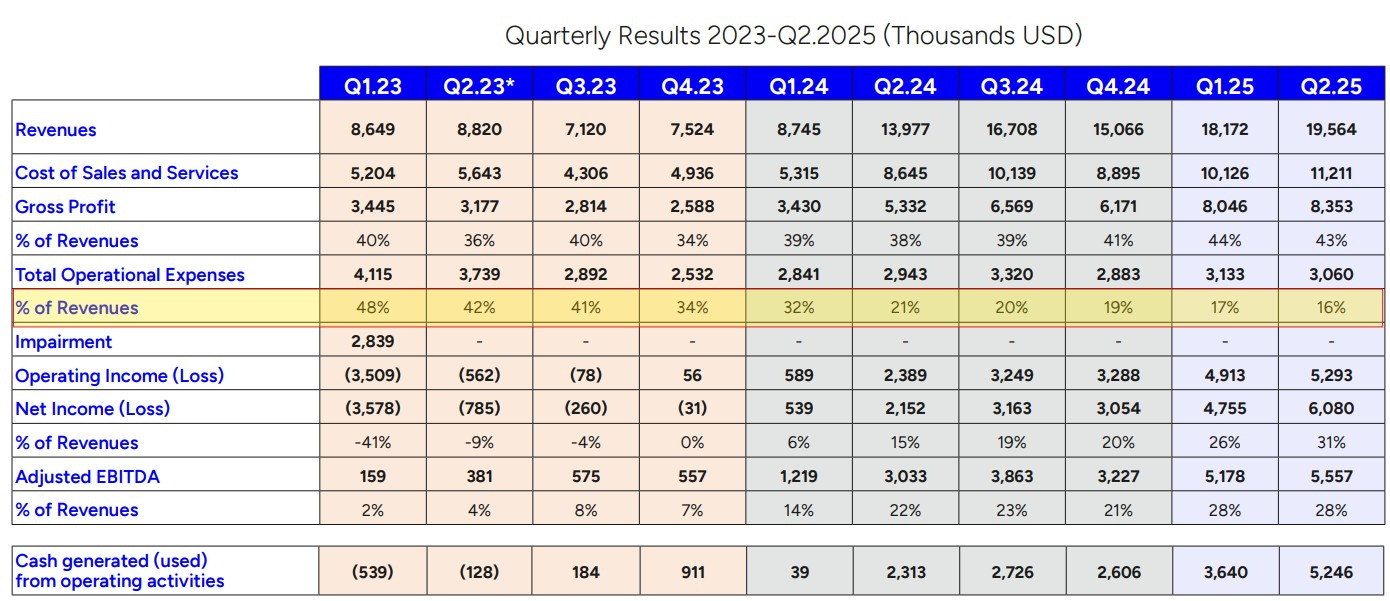 Revenues were up by 40% in the quarter to $19.6M vs $14M in Q2 of last year. They also delivered extremely well on margins with a 460 basis point improvement in gross profit from 38.1% to 42.7%, generating 57% more margin dollars than last year in the process.